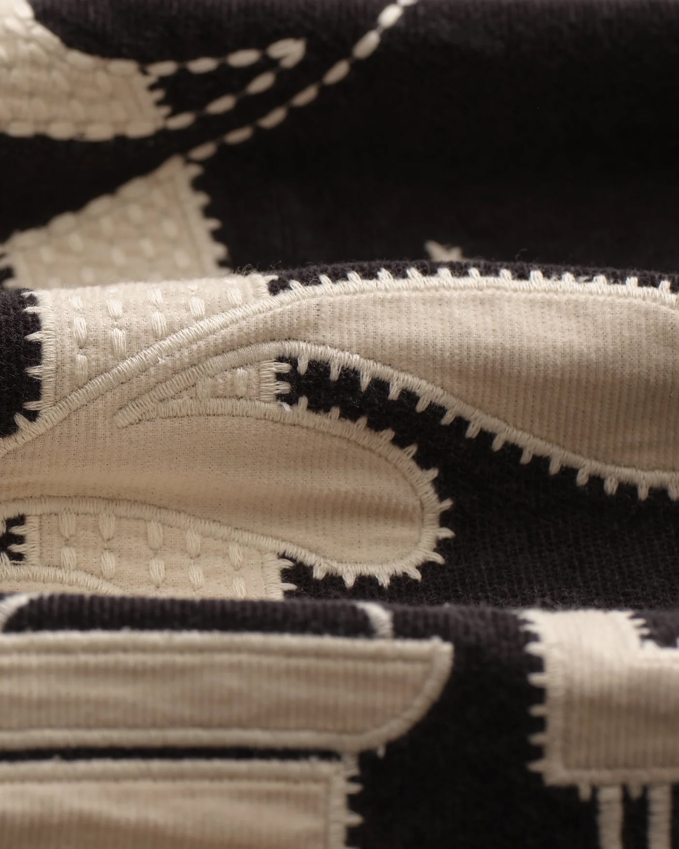 背面には、ベビーコーデュロイと大胆なチャンキー刺繍を組み合わせたアップリケ技法が施され、存在感のあるデザインに仕上がっています。