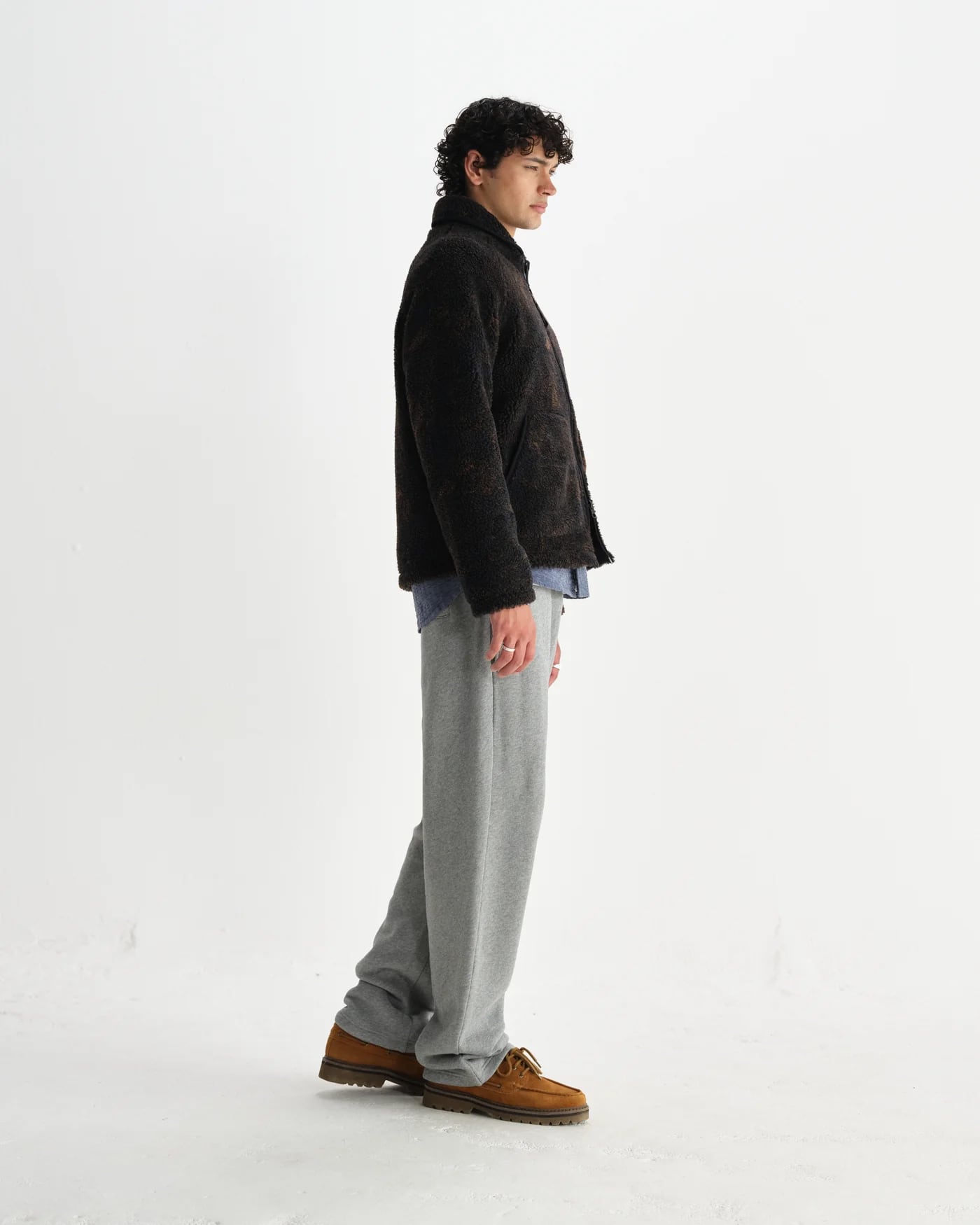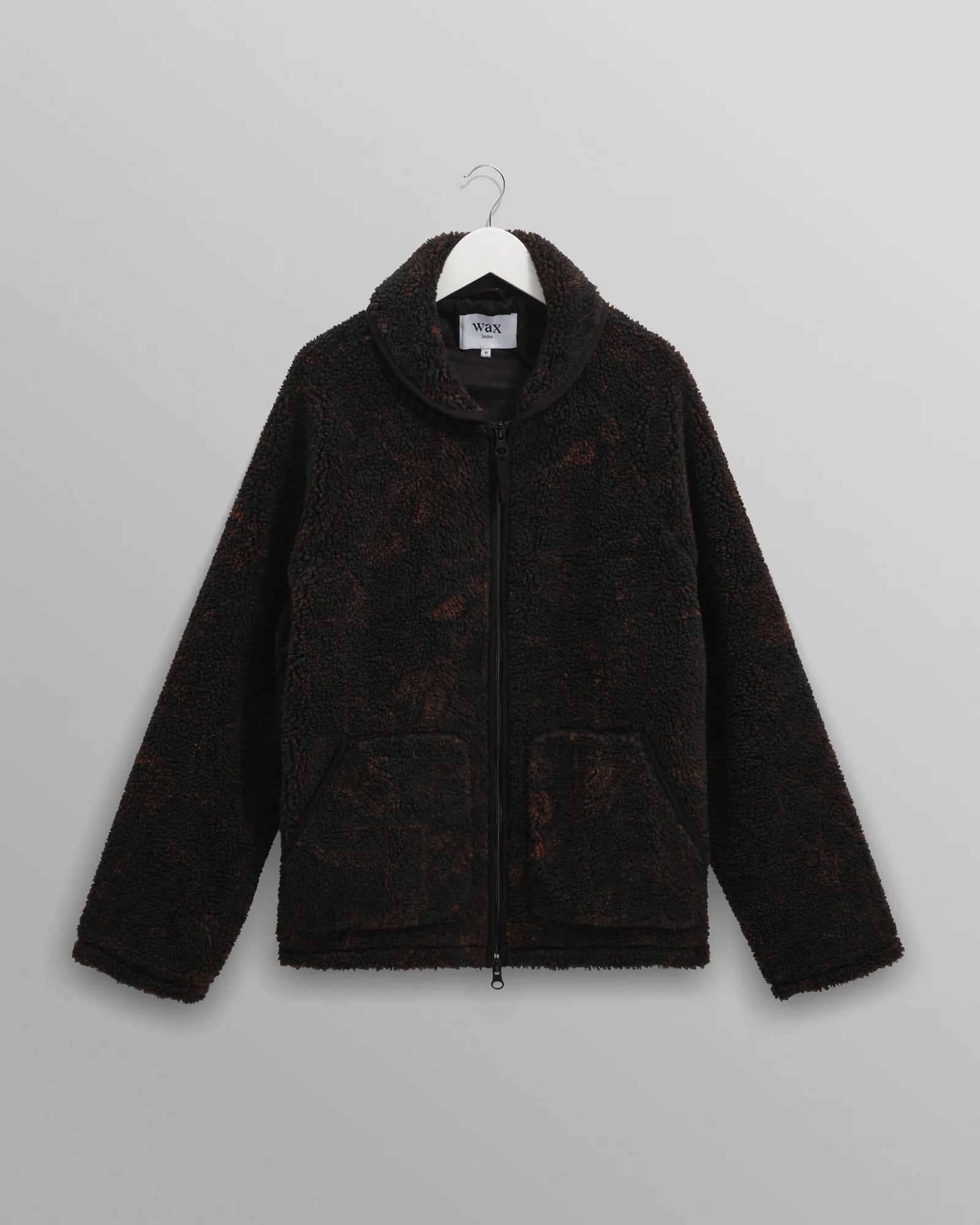 wax londonオリジナルのブラックxブラウンのペイズリー柄ジャカード織りのボアフリースジャケット。