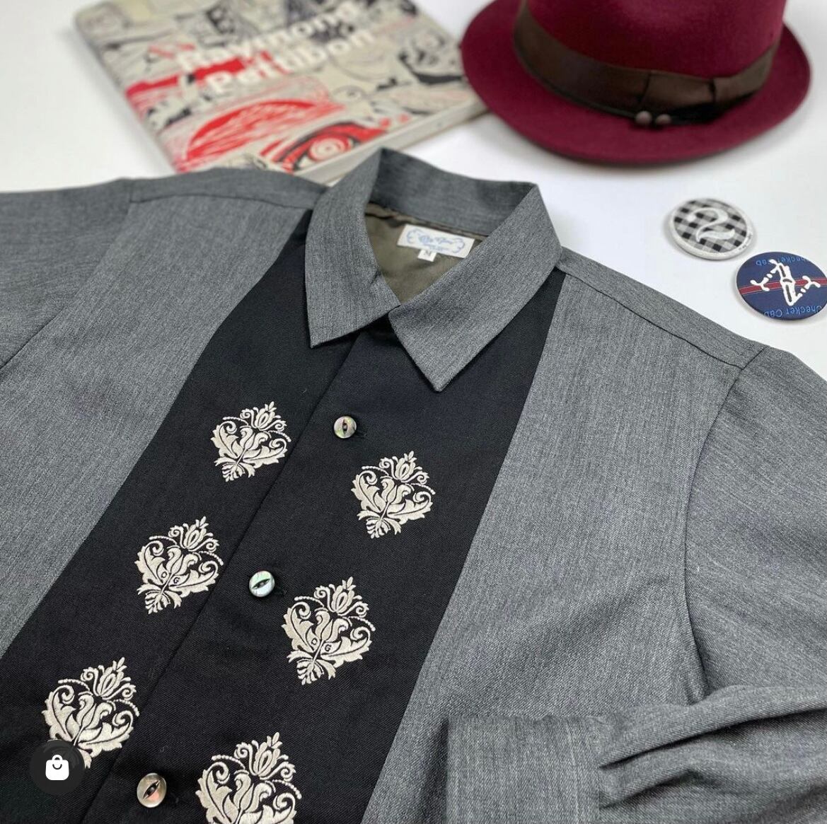 オリジナルのダマスク刺繍を施し、バイカラーで仕上がっているオープンカラータイプのシャツです。
