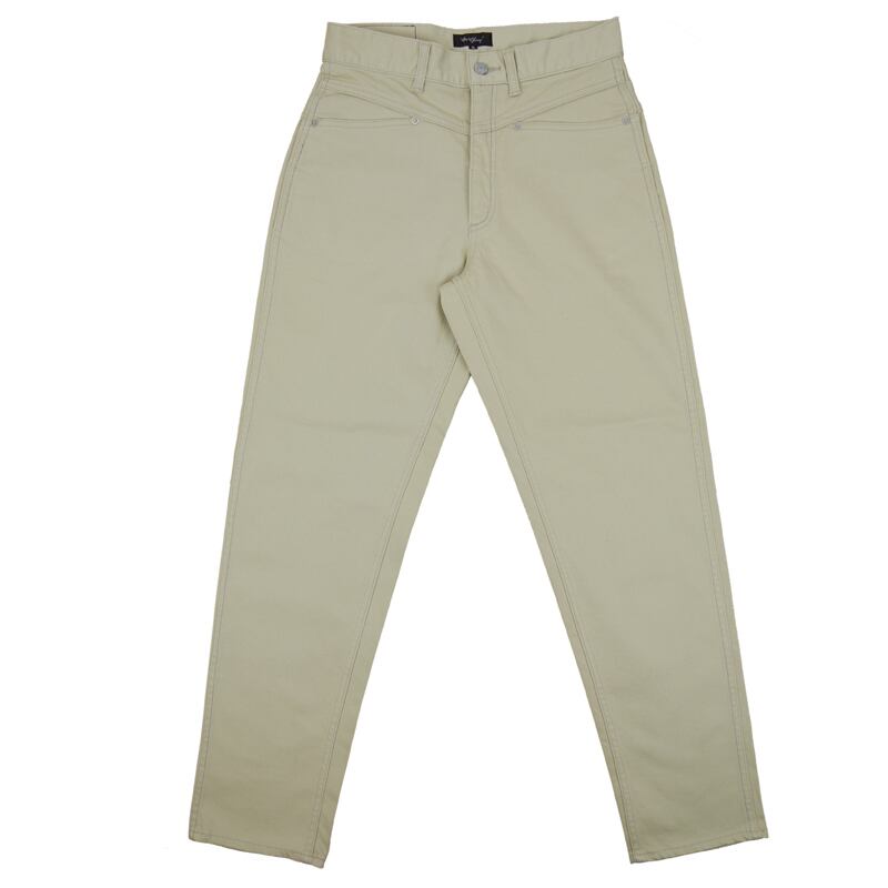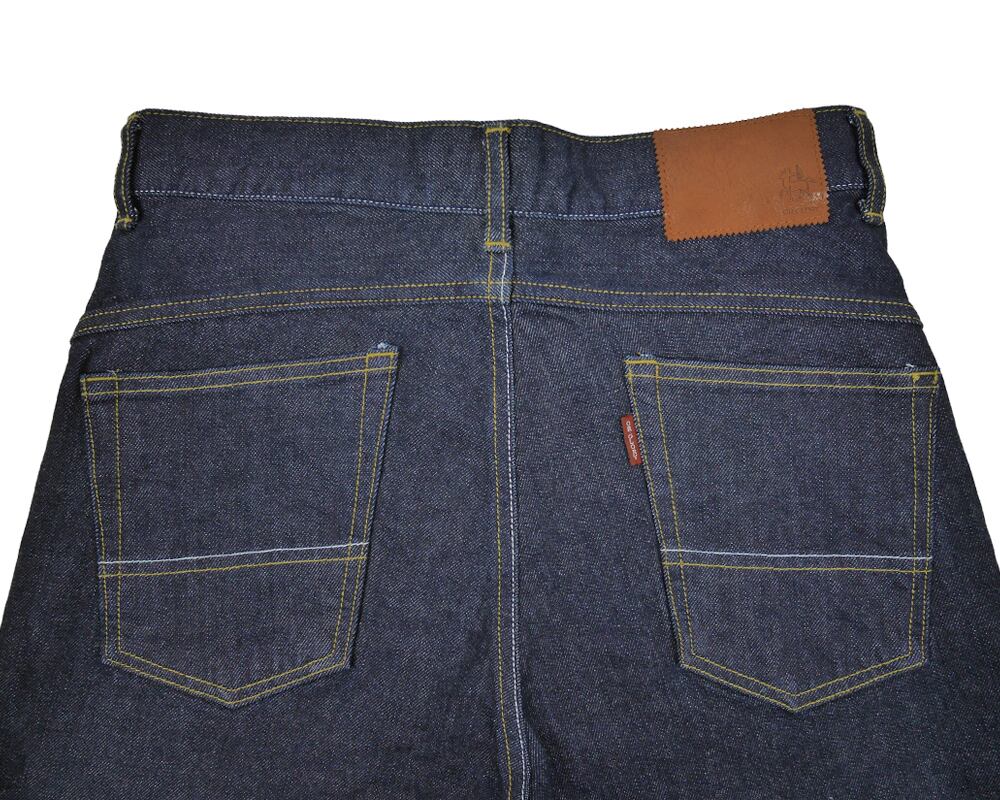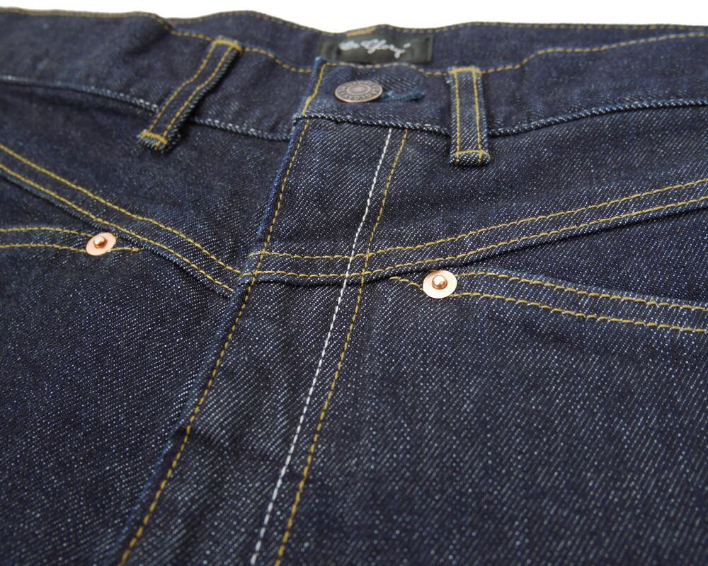 破れやすい後ポケットの下部には裏側からスレキを当てて強度を増したり、2色のステッチ使い等細かなディテールにも拘った1本です。