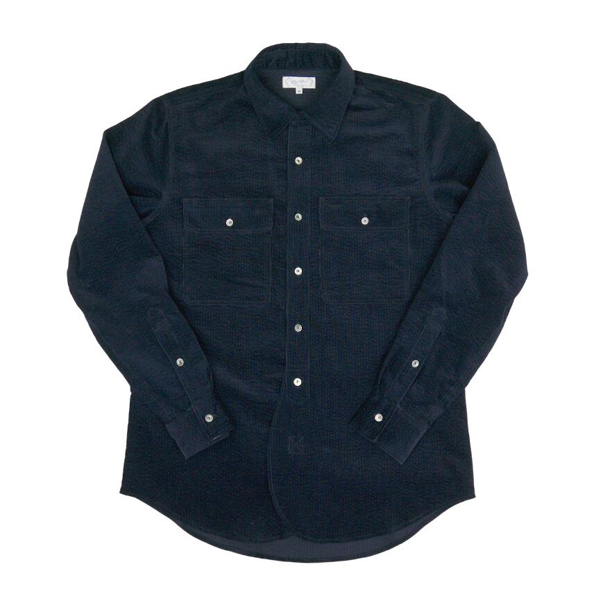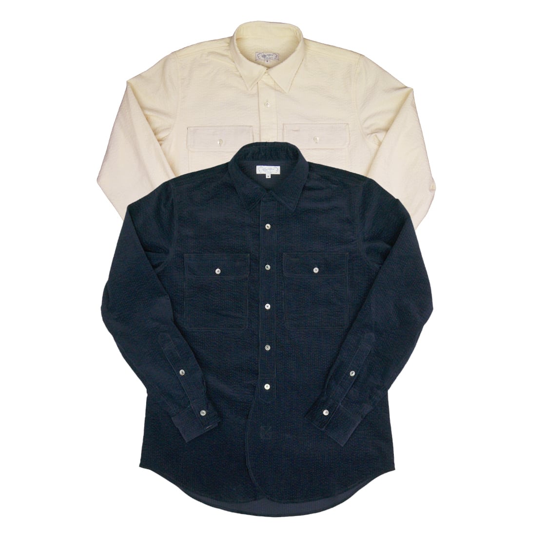 コーデュロイ生地に特殊加工をし、サッカー地のようなリップル(小波のような凹凸)を表現した面白い生地を採用した新型シャツです。