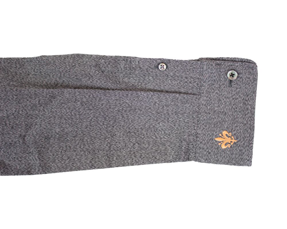 グレイは、往年のワークアイテムを彷彿とさせる黒シャンブレーのようなオックス生地を使用。